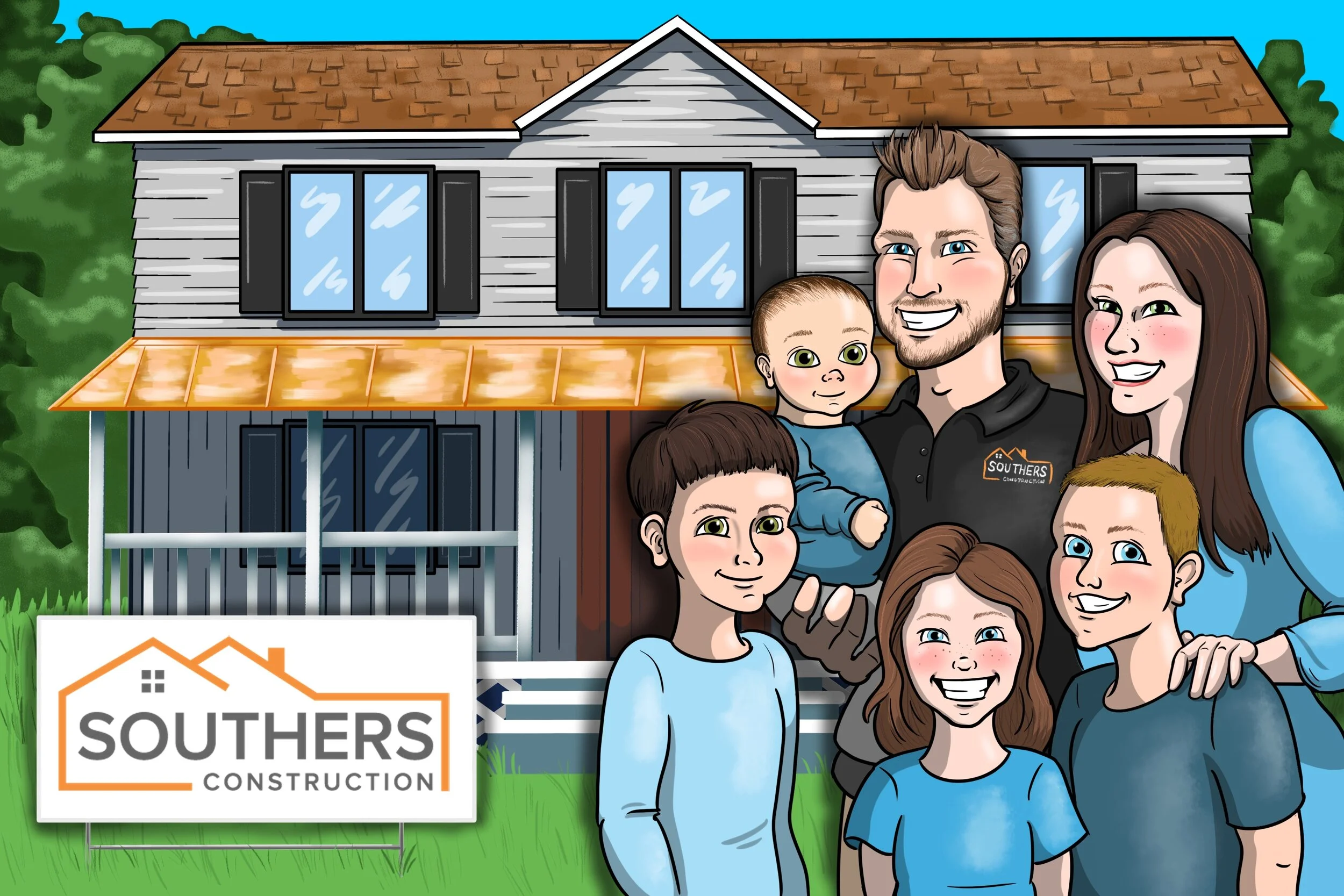 This was a 2020 freelance project commissioned by Southers Construction of New Hampshire. Starring the owner and his family, this illustration showcases the construction work and places emphasis on the importance of family to this company! This illustration will appear on promotional folders, mailers, and other print media, as well as their website.